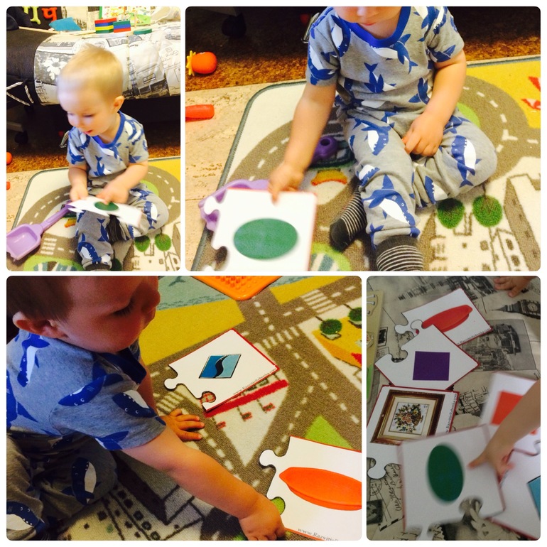 Дала снова Мите пазлы самодельные, как обычно, они у нас "не пошли")) есть небольшие достижения: я выбирала предмет (например, овальный тазик), а Митя выбирал нужную фигуру.