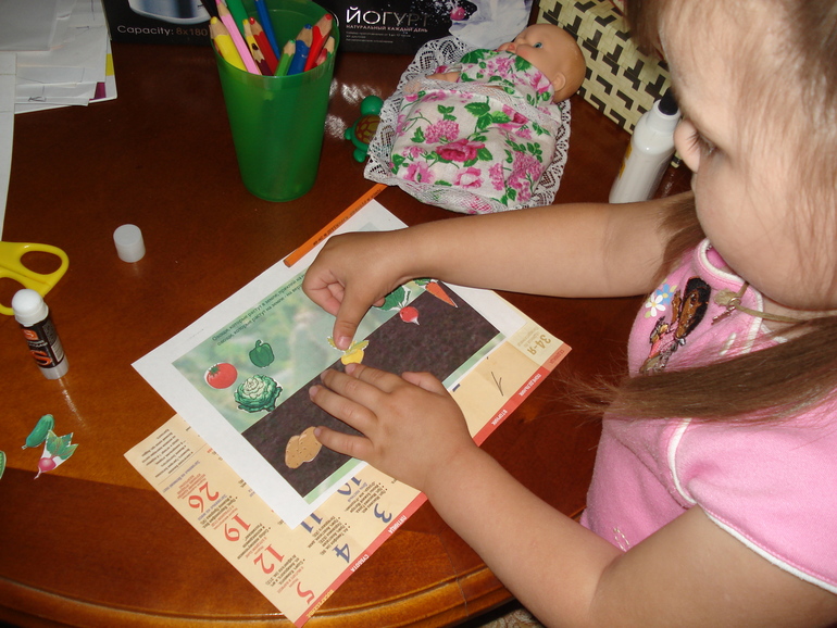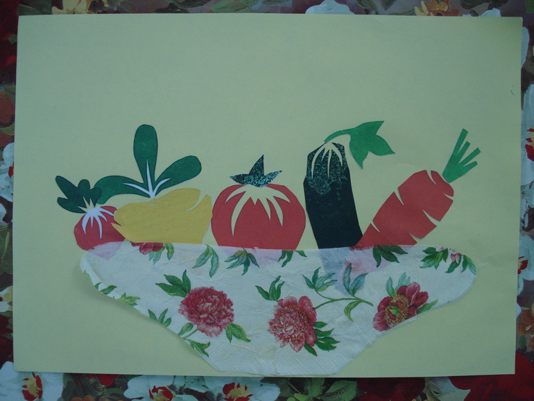Делали аппликацию "Урожайная тарелка". Ваня вырезал овощи, я зазубринки на них, Маша клеила.