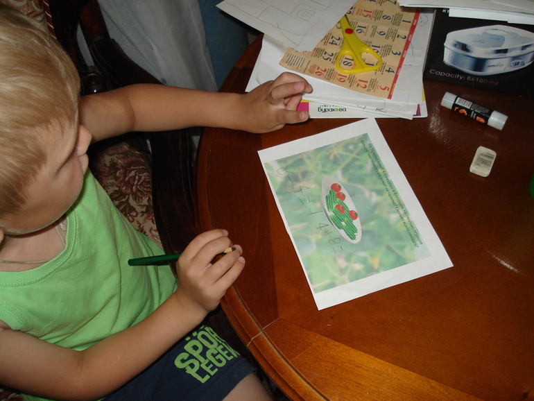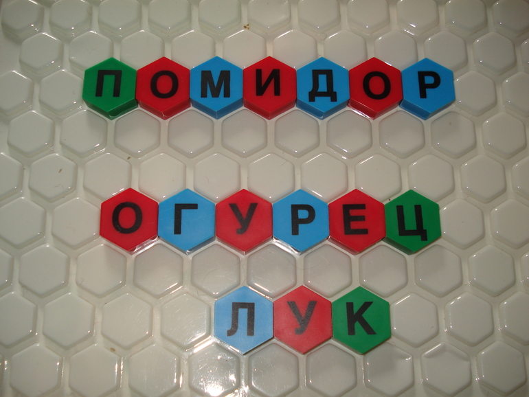 7. После вкусного обеда (с огурцами, конечно), Иван изъявил желание поиграть в мозаику с буквами. Я диктовала ему слова, он составлял.