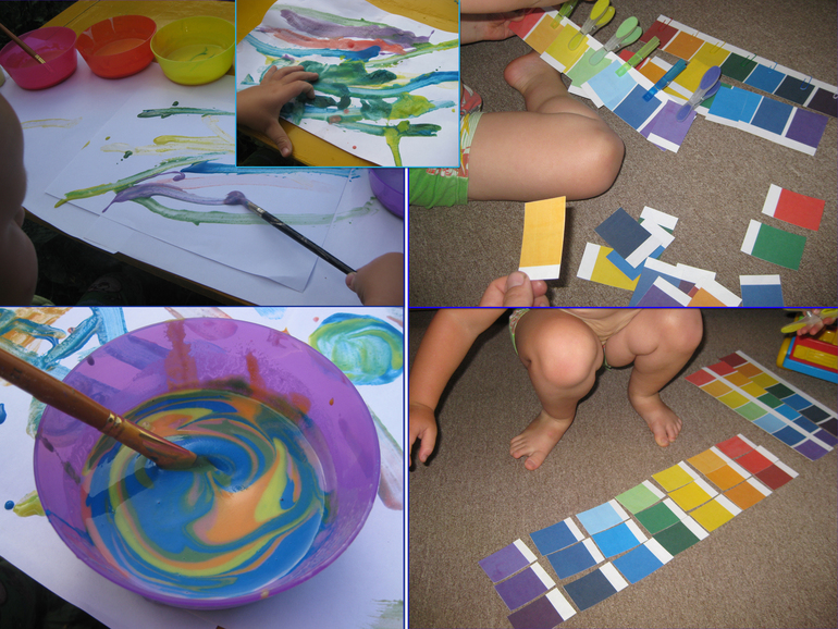 Потом Артем искал одинаковые палитры и скреплял их, а я эти же палитры разложила по оттенкам от светлого к темному, объясняла понятия светлее-темнее, сразу же запомнил.