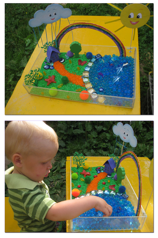 Ну и напоследок сенсорная коробочка из риса, гидрогелевых шариков и декоративных камешков, товарный вид за минуту потеряла, но провозился в ней минут 10 точно.