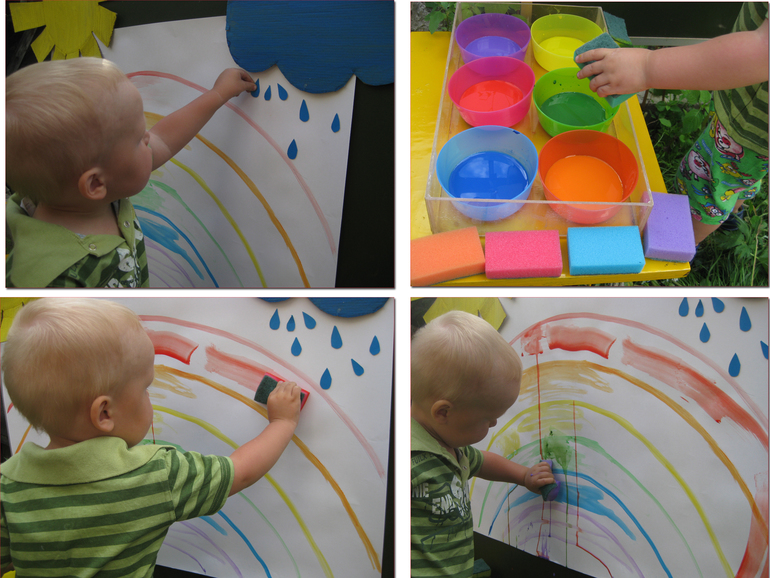 На улице совместно смастерили демонстрационный уголок «появление радуги»: прилепили солнышко, затем тучку, потом капельки-дождик, ну и губками, с моими небольшими подсказками, нарисовали радугу. Дальше, к огромной радости ребенка, была самостоятельная игра с губками и оставшейся гуашью, после которой я еле его отмыла.
