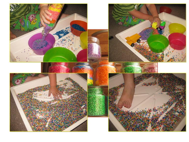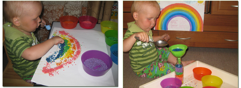 Вечерком делали радугу из цветного риса, радугу в бутылочке, вся крупа потом перемешивалась и превращалась в грузовой материал для машин и еще во что-то для рук и ног….. опять же самостоятельные ролевые игры.