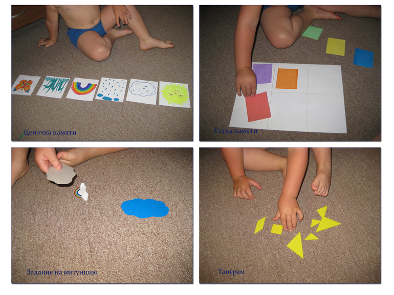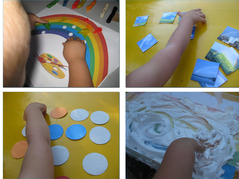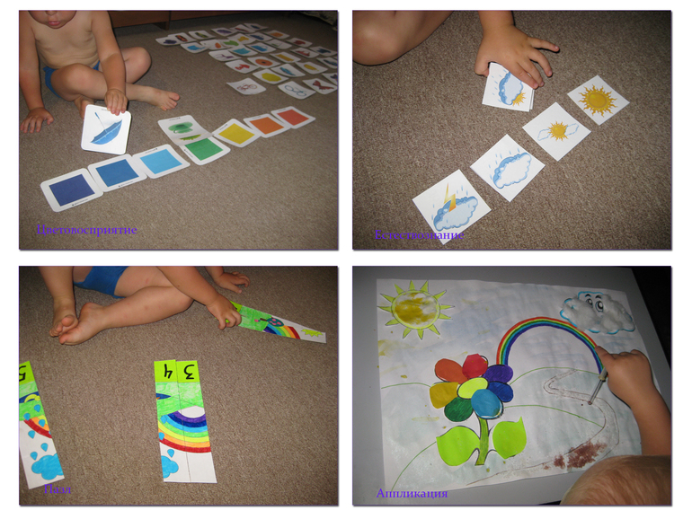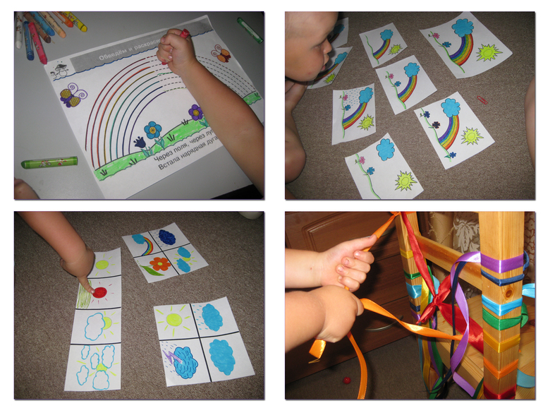 цепочка памяти, сетка памяти (из цветных карточек), интуиция (за каким облаком спряталась радуга), танграм, цветовосприятие (разложили карточки по цвету), естествознание (рассмотрели по картинкам появление радуги), собрали самодельный числовой пазл, моторика (аппликация: солнышко-ватный диск приклеить и покрасить, облачко заклеить ватой, наклеить лепесточки и листочки на цветок, дорожка - полить клеем, посыпать солью, накапать краской из пипетки).