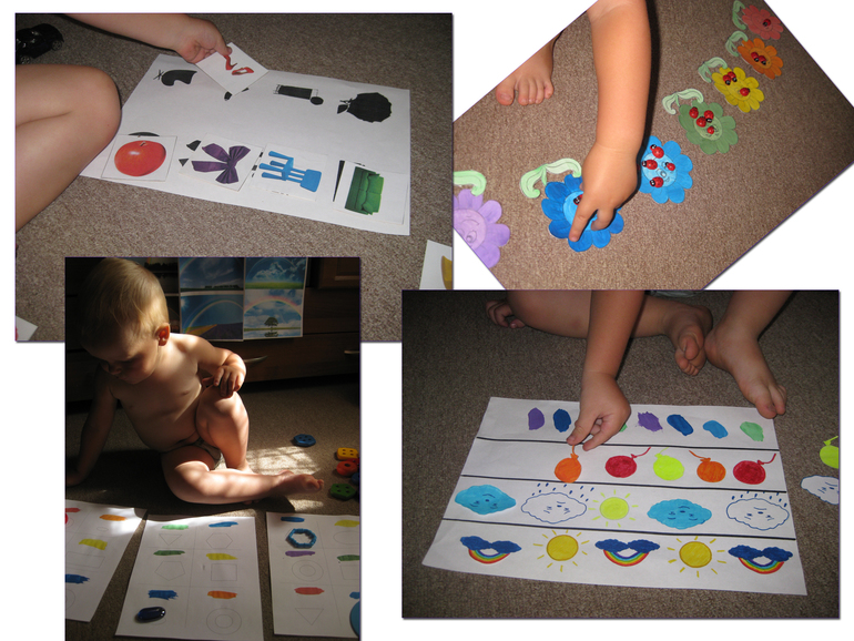 Задание на поиск тени, повторение счета: разложили жучков по цветочкам, по нарисованным пиктограммам искали разноцветные предметы, задание на продолжение ряда.