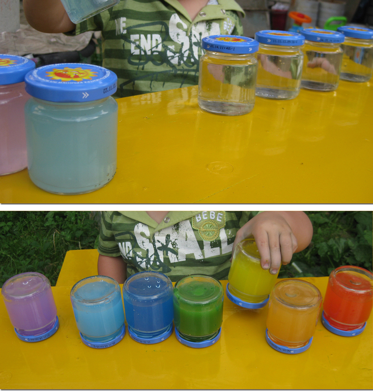 Пока был тихий час, я выставила на улице баночки с водой, крышки которых с внутренней стороны закрасила краской. Артём их тряс и переворачивал, чтобы водичка окрашивалась в разные цвета, потом опять самостоятельно играл, откручивая крышки и сливая воду в одну емкость, в разные бутылочки, в ямки, опять в баночки…… и до бесконечности, короче, беспроигрышный вариант для меня занять ребенка - это дать ему много воды.