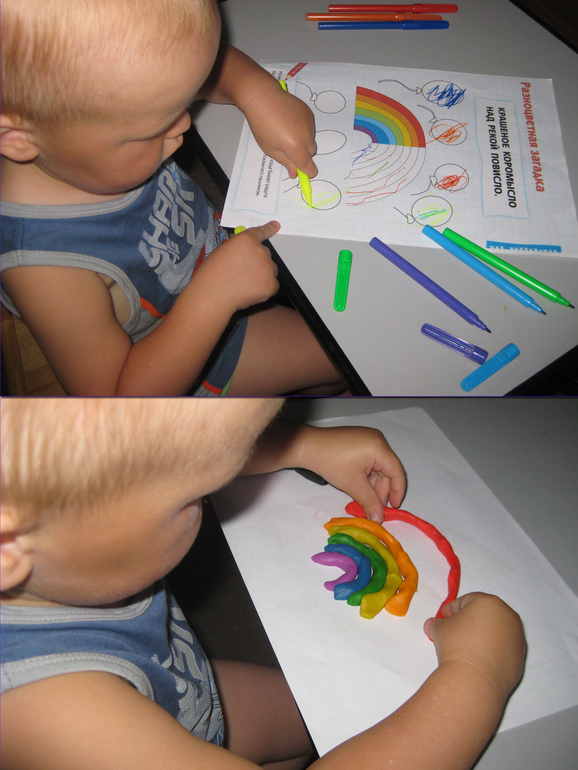 Первый день начали с дорисовки радуги и раскраски шариков во все цвета радуги. Сделали радугу из пластилина, порядок расположения цветных дуг подсказывала.