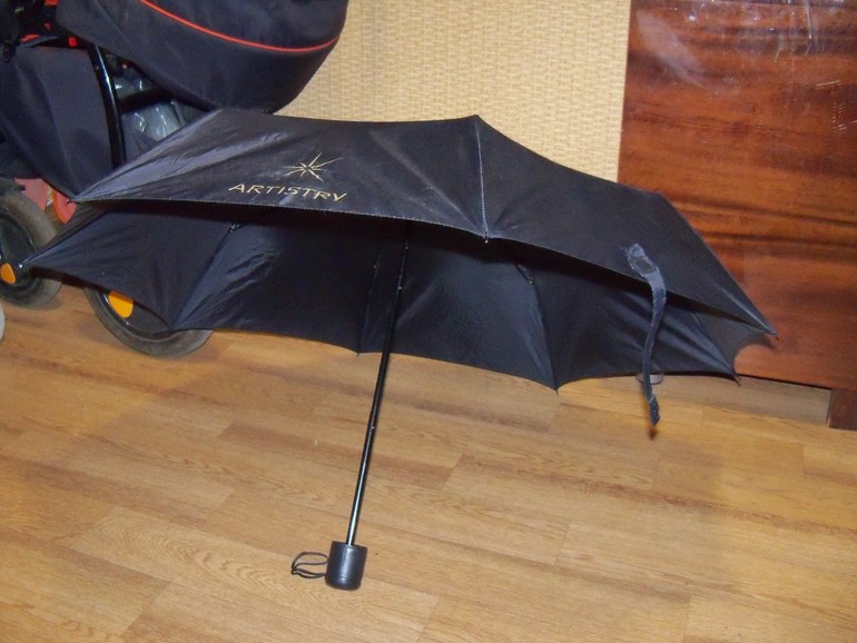 Обыграли зонт. Ходили под моросящим дождем в магазин. Мир пытался держать зонтик. Дома заползал под него на животе.
