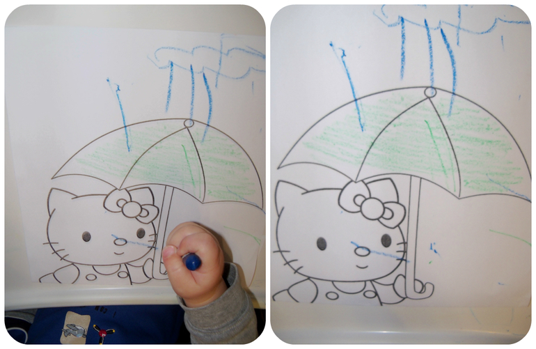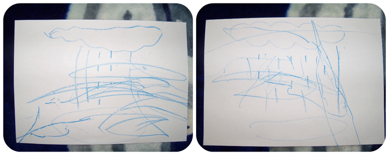 Но Мир все равно нарисовал свой коронный ураганный дождь. Я показывала, как рисовать вертикальные полосочки, водила его ручкой.