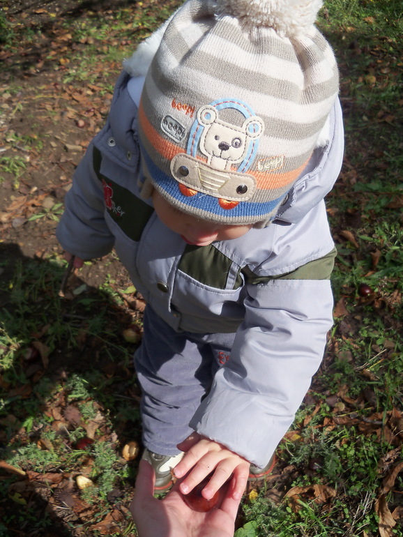 В сенсорной коробке сегодня были только каштаны. Запускал в них обе руки, раскидывал по кухне, я собирала, он снова раскидывал, разметал буквально