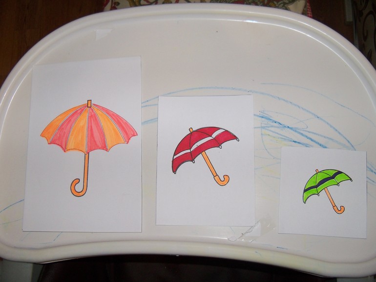 Посмотрели зонтики, вспомнили, где большой, маленький, средний. Я вспомнила. Мир не очень хотел вспоминать. Пару раз выполнили задание на сортировку. Игры не очень пошли.