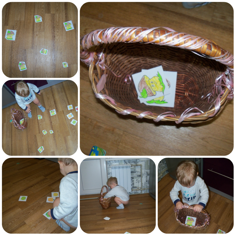 Потом играли в грибную полянку. Разложила на полу картинки с грибами и . Достала корзинку, сам начал туда складывать, потом веселился, но по моей просьбе собирал яблочки и грибы.