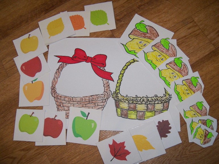 Играли в сортировку - раскладывали яблоки, листики, грибочки по , пазл собирали
