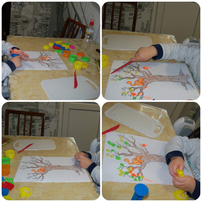 Делали листики из пластилина на дереве (шаблон был такой же как и в прошлый раз, т.к. Миру очень понравилось, что там была кошка)