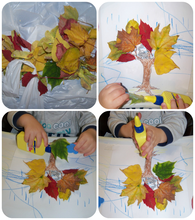 Сегодня познакомились с баночным клеем. Баночка естественно произвела фурор. Я показала, как наносить клей, поначалу даже вместе со мной мазал клеем листики.