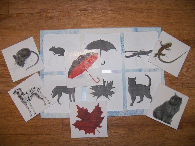 Играли в ассоциативное лото от Лизы. Активно называл мышку, собаку и кота. Зато зонтик положил правильно с первого раза, почти попал на листик.