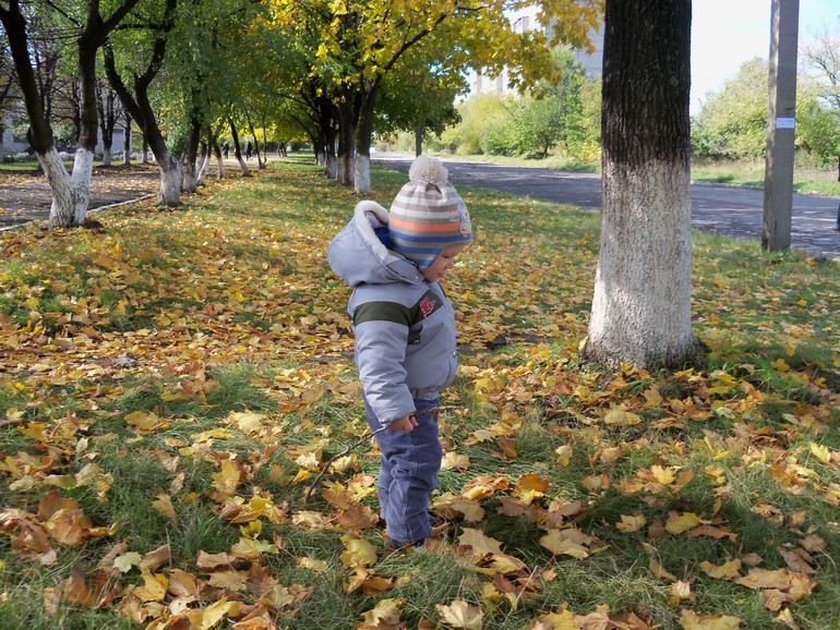 На прогулке кормили голубей, бегали за ними. Собирали листики и каштаны, убегали от дождика.