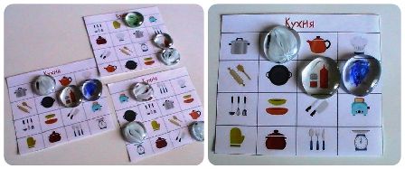 Очень похоже на Русское лото с бочонками. Каждому игроку раздаем по карточке. Ведущий тянет фишки с изображением кухонной утвари, а игроки закрывают их на карточках.