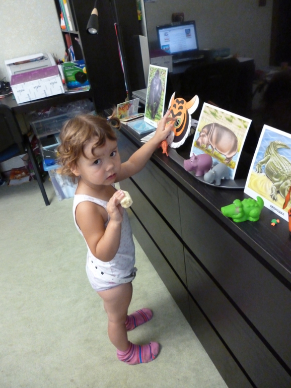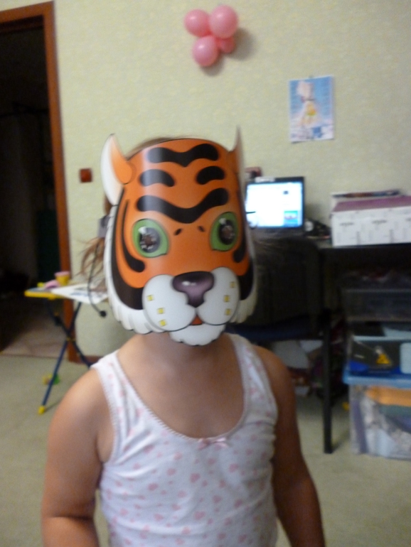 А потом пришел Тигр (мама надела маску тигра, Катя немного опешила. Осторожно спросила мама не тигр, это мама играет))). С Тигром Катя делала зарядку, рычала и помогла тигру найти маленьких тигрят (книжка с наклейками) Катя тоже захотела стать тигром