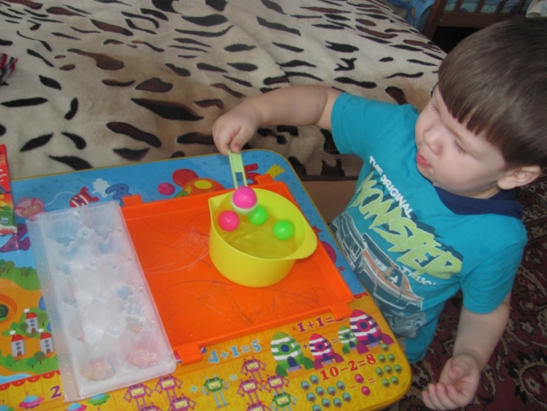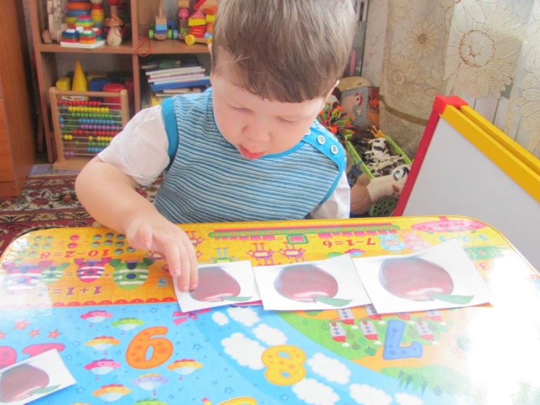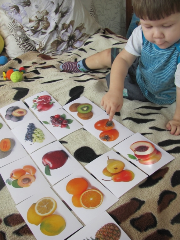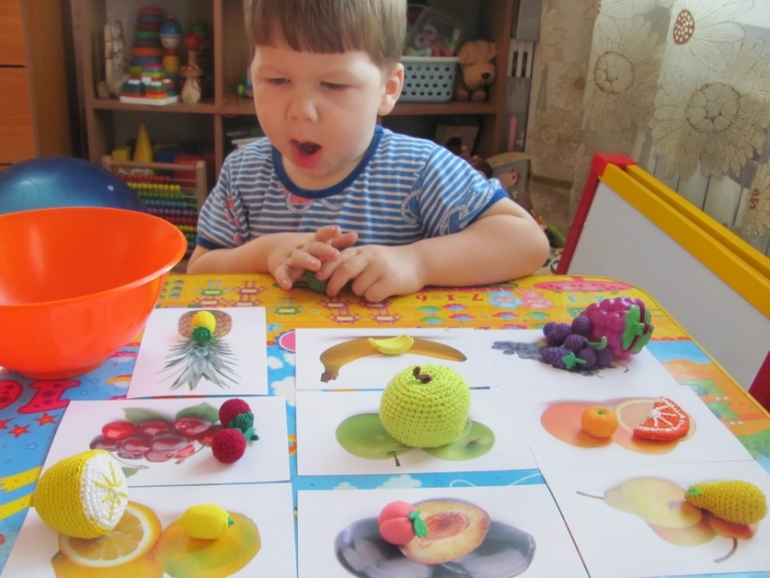 Проверяли на запоминание названия фруктов. Я говорила, а Денис показывал. На тот период он плохо еще проговаривал. Но к концу дня он говорил хурма, гиви, абьикос и а-на-нась.