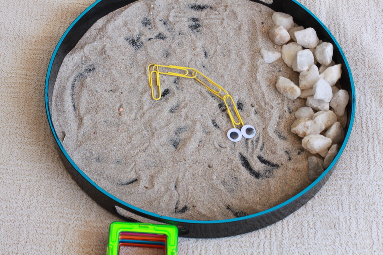 2. Змея. Мы поиграли с песочком +змея из скрепок+ магнит (идею здесь на ББ увидела), это была супер идея! Восторг в глазах ребенка:)