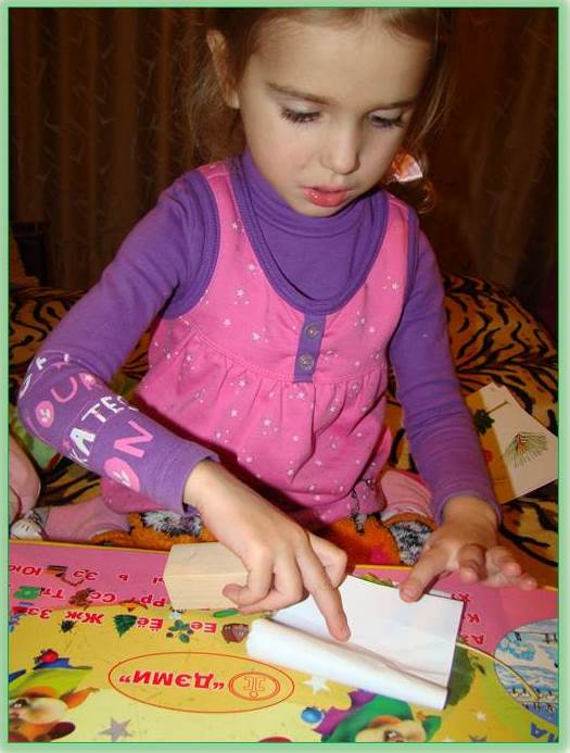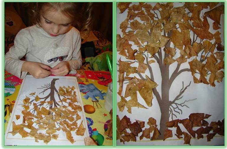 Сделали осеннее дерево, а потом провели маленький эксперимент, чтобы понять, почему листочки осенью желтеют: Свернули листочки в бумагу и Даша постучала кубиком по листикам - на листке бумаги остались зеленые пятнышки. Что это значит? В листочках содержится некоторое зелёное вещество, которое делает листочек зелёным. Летом, когда на улице тепло этого вещества в листочке много, поэтому и листик имеет зеленый цвет, осенью, когда становится холодно, это зеленое вещество постепенно исчезает и листочек становится жёлтым