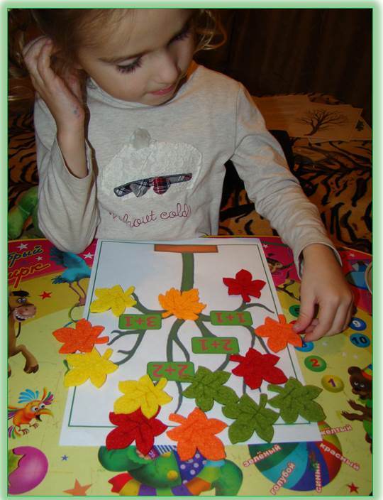 Делали осеннее дерево - вешали листочки на дерево и решали примеры: