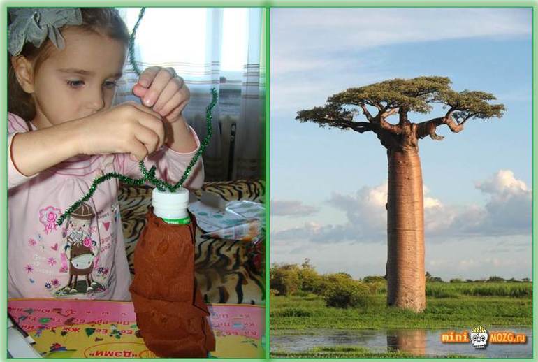Сделали свой баобаб. Баобаб называют также бутылочным деревом, поэтому в качестве ствола мы использовали бутылку, обмотали её корой, воткнули веточки - баобаб готов: