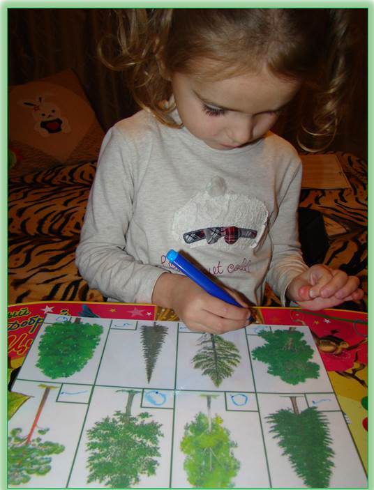 Рассказала Даше о том, что все деревья делятся на два вида: лиственные и хвойные, повспоминали, какие деревья мы знаем лиственные, какие хвойные и отметили на карточке лиственные деревья - кружочек (листочек), а хвойные деревья - чёрточка (иголочка)