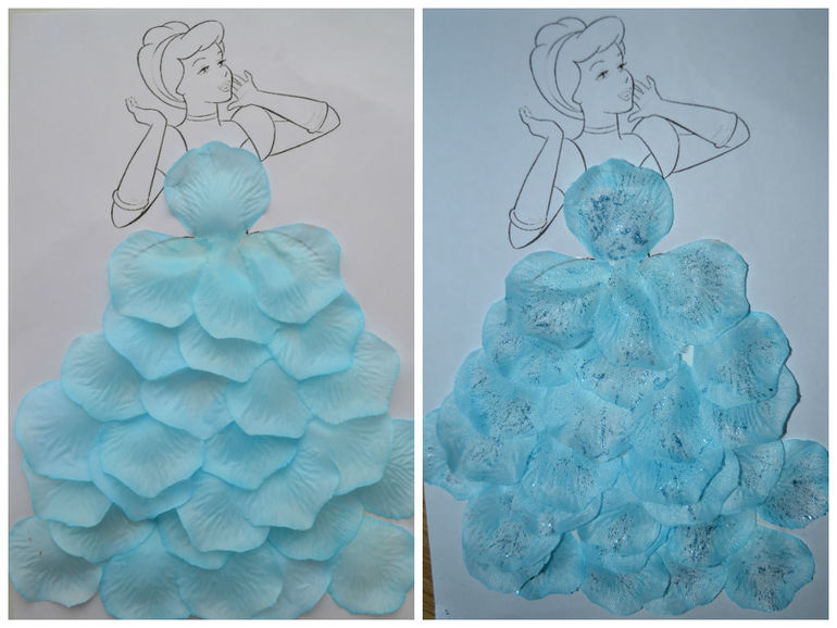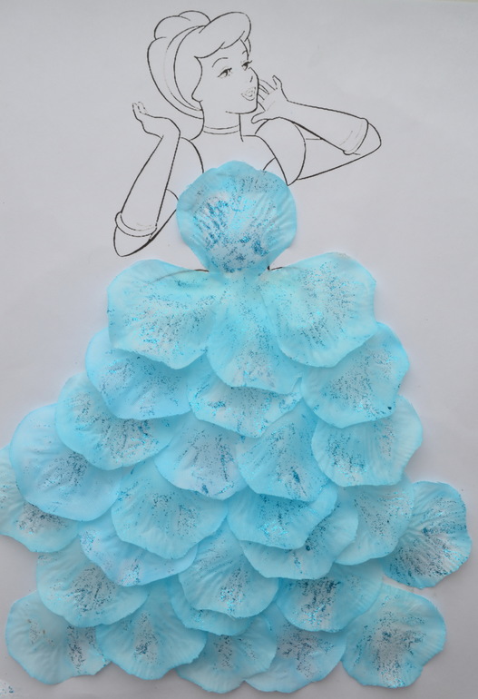 Ну и конечно же - платье(белые лепестки я предварительно покрасила в пищевом красителе. Клеились к скотчу хорошо, но потом некоторые отпадают) Дочка приклеила только несколько лепестков, но зато потом с удовольствие обильно нанесла клей с блестками!