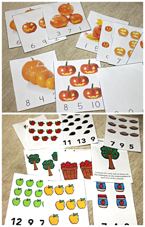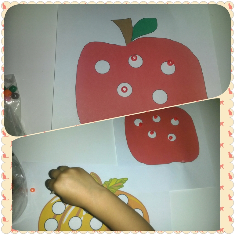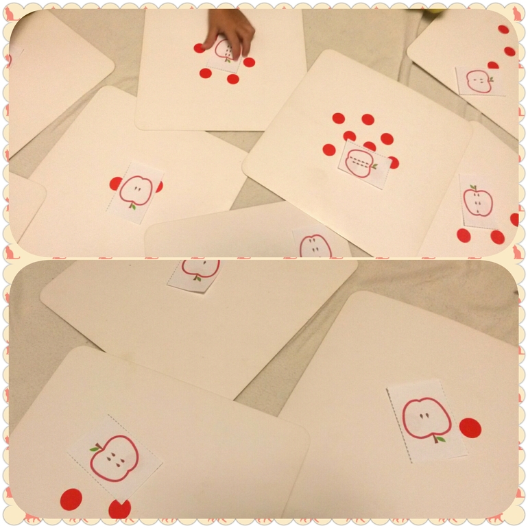 - Карточки с красными точками и яблоки с семечками - найди яблоко, у которого столько же семечек, сколько точек на карточке