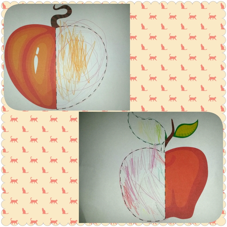 - Обведи контур, раскрась половинки (контур помогала, держала Варину руку, но не слишком крепко)