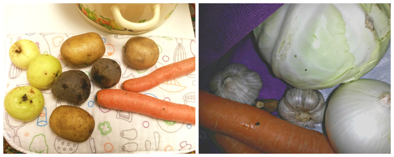 В мешочке - капуста, лук, головки чеснока и долька, картофель, яблочки, морковь, свекла.