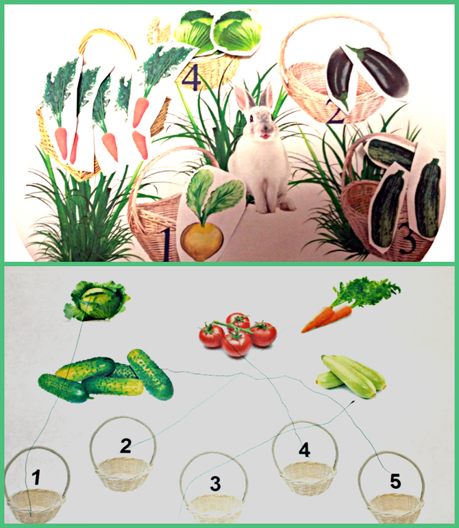 - Разложи в корзинки соответствующее количество овощей