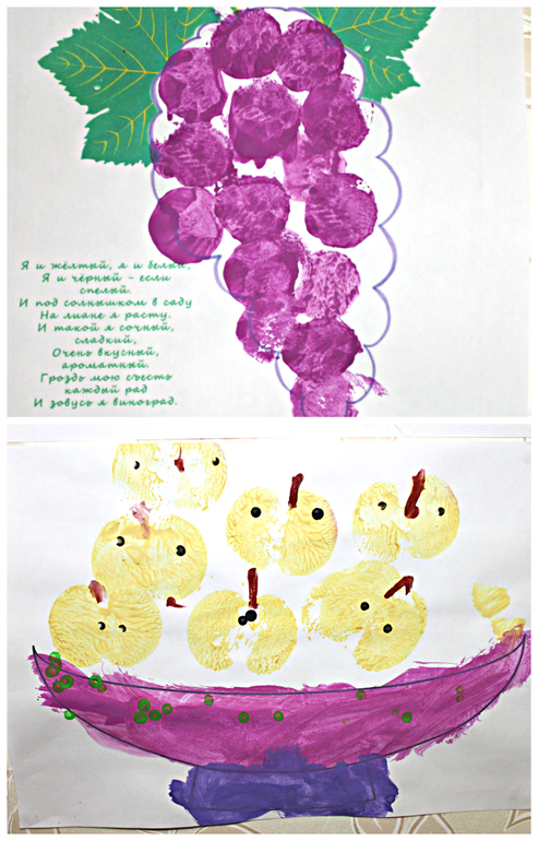 - Вазочка с яблоками (отпечатывали половинку яблока, ватными палочками - семечки и крапинки на вазочке)