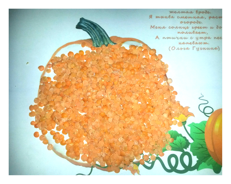 - Тыква: ПВА + чечевица - первый опыт "крупяной" аппликации