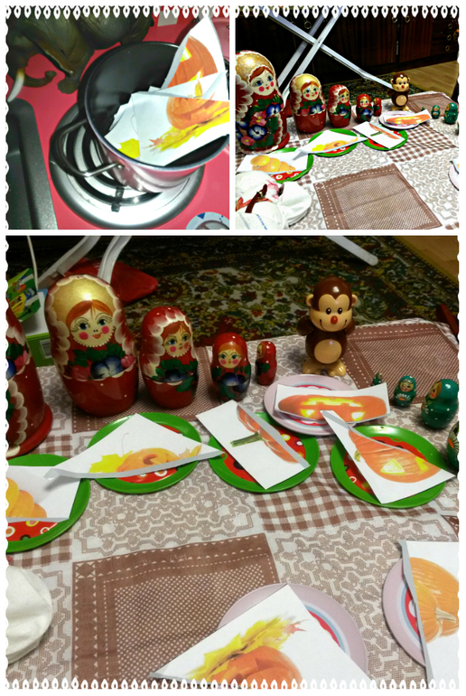 Варя захотела что-нибудь поразрезать - пожалуйста, вот тебе тыковки. А чтобы было интересно, сварим из них кашку. Идея нашла живой отклик, ребенок с большим энтузиазмом принялся орудовать ножницами (до этого, видимо, не было особого стимула, и Варе не больно нравилось, быстро отступала) и складывать кусочки тыквы в кастрюльку. Потом она поставила кашу вариться, мы накрыли стол скатертью - Варя была в полном восторге и полностью погрузилась в игру. Позвала матрешек и обезьянку в гости, рассадила их, выдала всем тарелочки, угостила блинами, вела с ними разговоры и т.д., пока каша готовилась. Через час (не шучу, прошёл час, не меньше) Варя накормила их кашей из тыквы, себя тоже не забыла)))