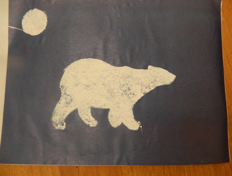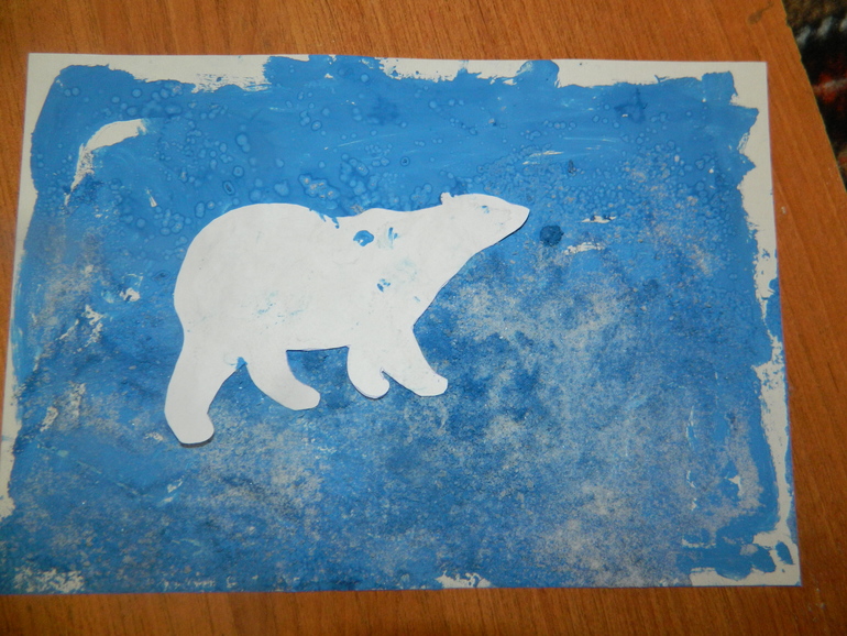 - Творим))) . Мишки (на первом рисунке мишка из бумаги, фон гуашь плюс соль, на втором разукрасили мишку губкой через трафарет)