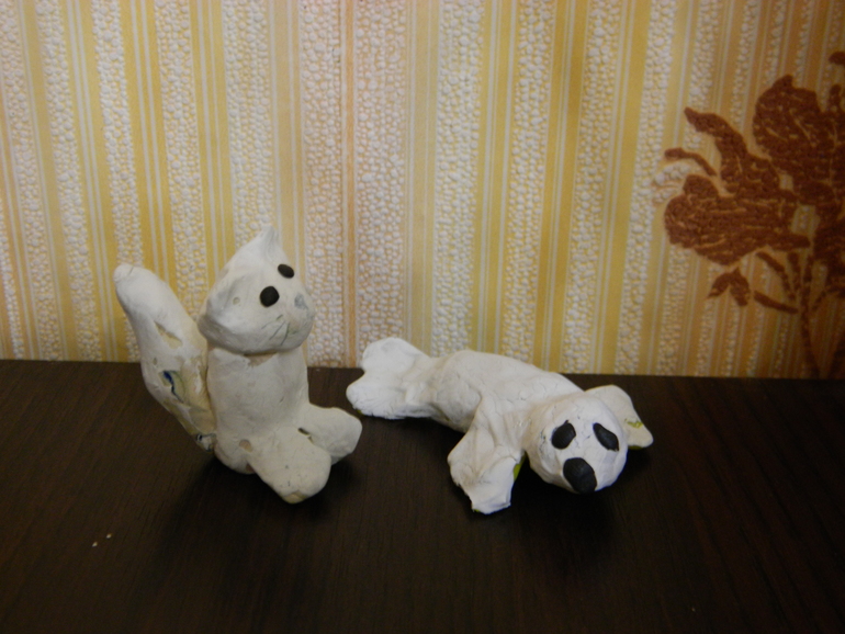 Вместе слепили вот таких котиков. Ванечка раскрасил гуашью и из пластилина сделал глазки и нос.