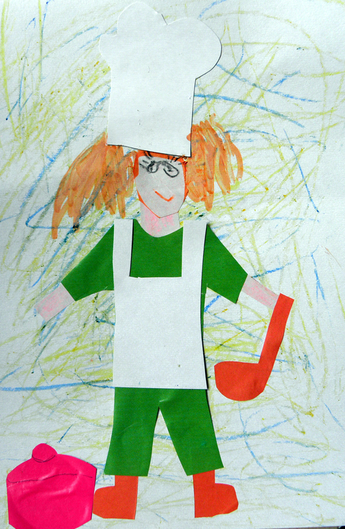 Так что пришлось сделать поварской колпак (такой же принцип как с докторским колпаком - картонка, сверху пристеплирела вырезанный круг из белой ткани):