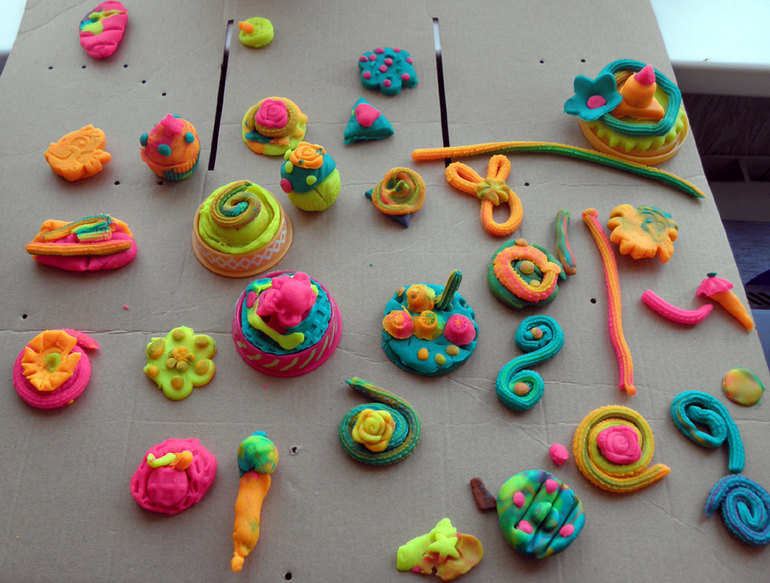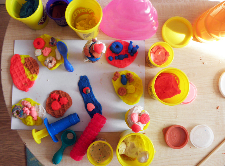 Ну и конечно любимый пластилин Play-Doh. Уже давно играет в станцию по изготовлению тортов, на этот раз в два раза усерднее))) Подарили еще мини фабрику по изготовлению мороженого! Налепила целую кучу всего: