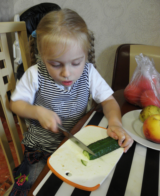 Резала настоящим ножом овощи и фрукты для салатов. Нормально получилось, с тех пор делает себе и Лизе салатики!