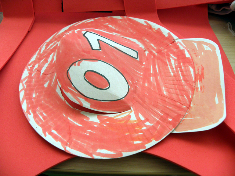 Смастерили такую шапку: я склеила одноразовую тарелку с козырьком, Соня разрисовала: