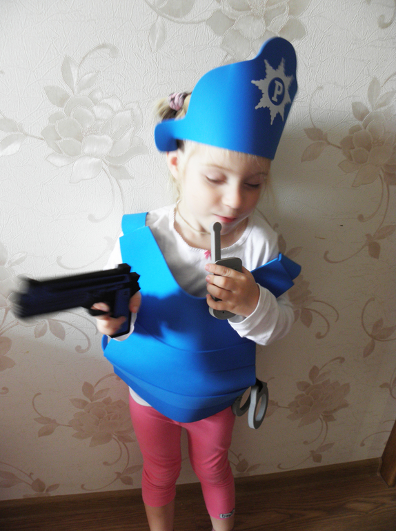 В костюме полицейского играла в поиск пропавших вещей. Я давала описание предмета, Соня по рации объявляла розыск, ну и сама его находила, виновника судили и сажали в тюрьму)