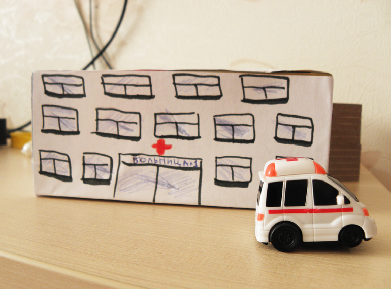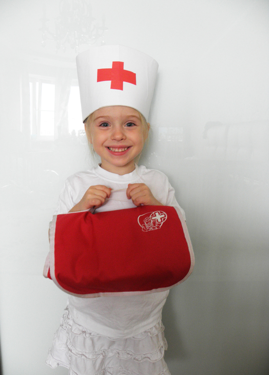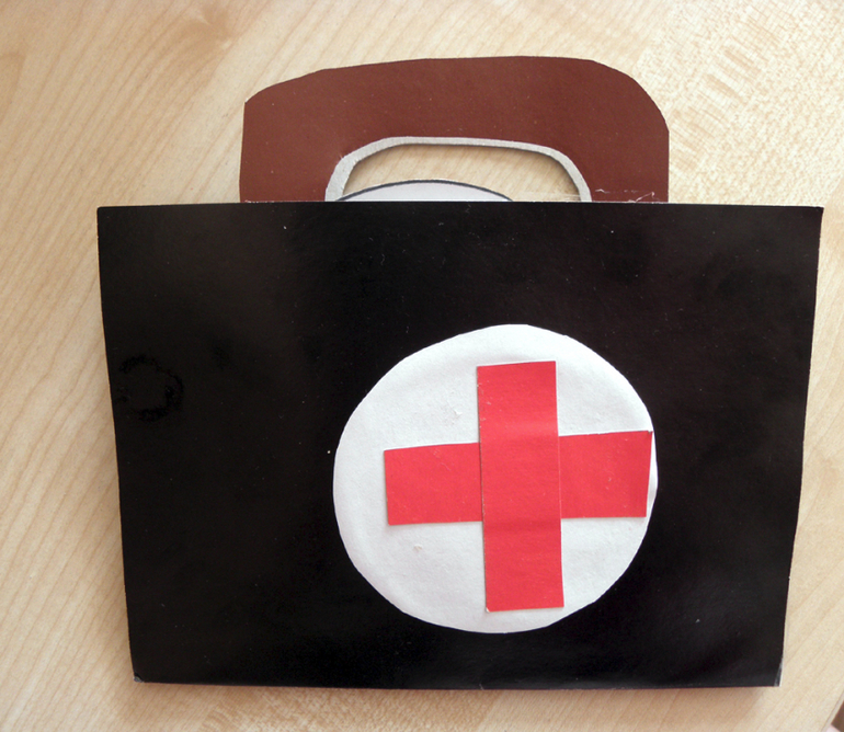 Сумка доктора уже давно имеется, так что сделала Соне из картона шапку (просто склеила широкую полоску), она сама вырезала красный крест и приклеила его на шапку.