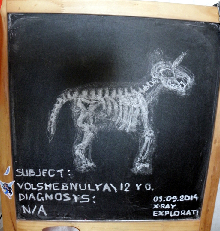 Вот такие снимки получились, папа рисовал мелом на доске, а Соня держала за доской своего единорога, потом уже и Соня освоила профессию рентгенолога и с успехом рисовала многочисленные скелеты.