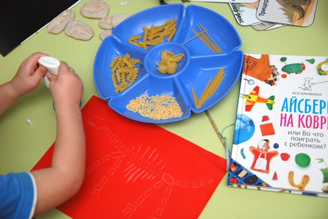 Сашулька с братишкой изучает)Карточки с динозаврами великолепные)Из макарон - здоровский скелет динозавра) Я Роське хотела человеческий сделать)