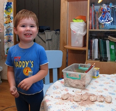 Яйца динозавров. Мише очень понравилось. Пробовали с помощью винта раскалывать, но неудобно, в другой раз пробовли с помощью отвертки, значительно лучше. Потом призвали на помощь воду.