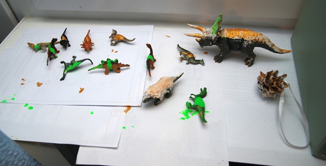 А это так посмеяться. Достала я перед новым годом шишки, краски, мол, Мишенька, игрушечки на елочку нужны. "Мам, ты шишечку крась, а я динозавров буду":