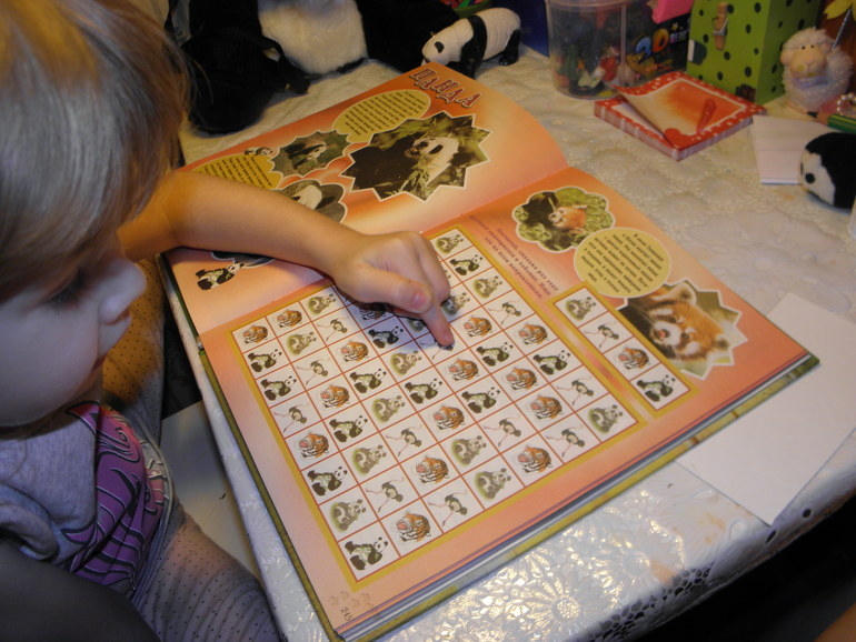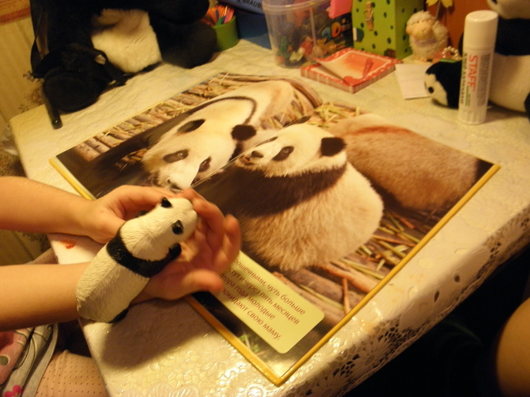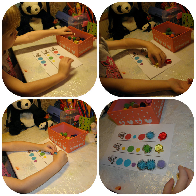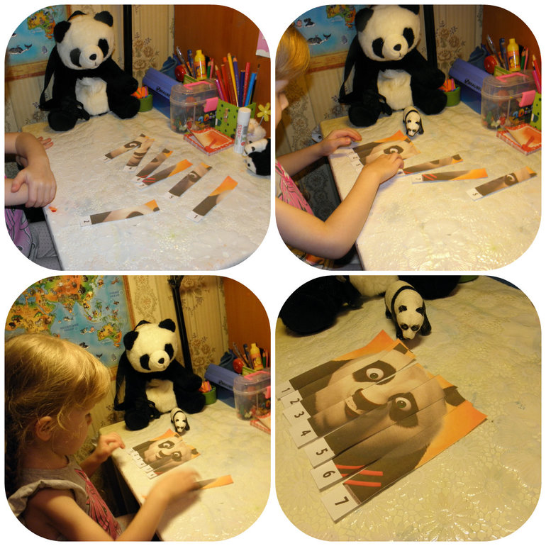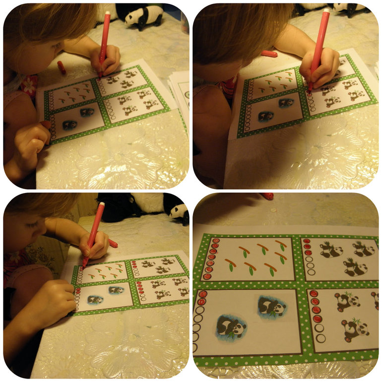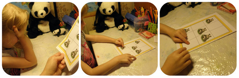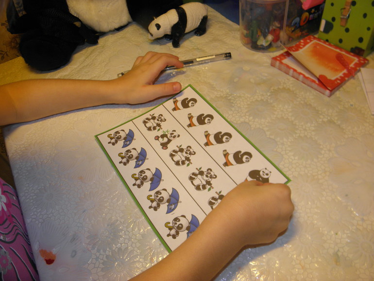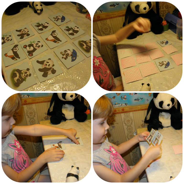 память, показываю картинку , закрывает глаза, переворачиваю, Поля определяет какой панды не хватает